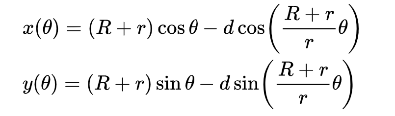 The next post in this series discusses using this formula to write a Python program to generate G-code to control a 3D printer or laser cutter to make spirographs.