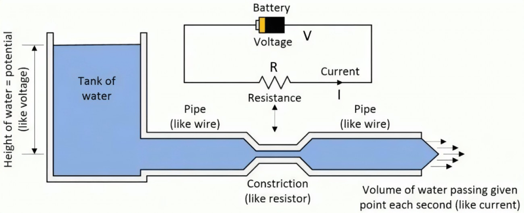 - Voltage is similar to the amount of pressure in a pipe caused by the height of the water. Voltage can be thought of as the amount of force pushing the electricity