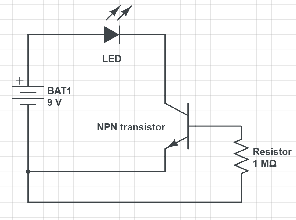 - We looked at this circuit and saw how a very small amount of current passing through a high resistance such as my body was enough to activate the transistor and allow the current to flow through the LED and transistor.