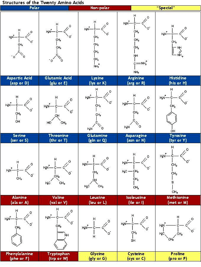 - Proteins are made of 20 different amino acids in humans. There are a couple of additional amino acids that are found in proteins in other organisms.