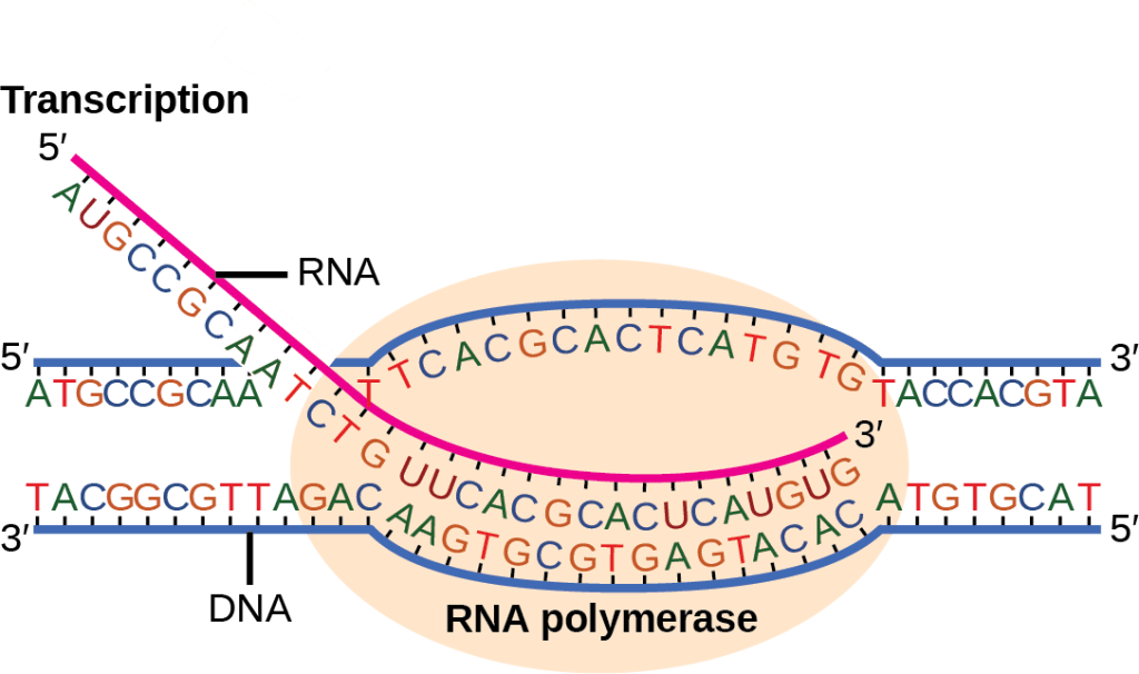 - On the DNA strand, an A (adenine) indicates a U (uracil) should be added to the RNA strand, a G (guanine) indicates a C (cytosine) should be added, a C indicates a G should be added, and a T (thymine) indicates an A should be added.