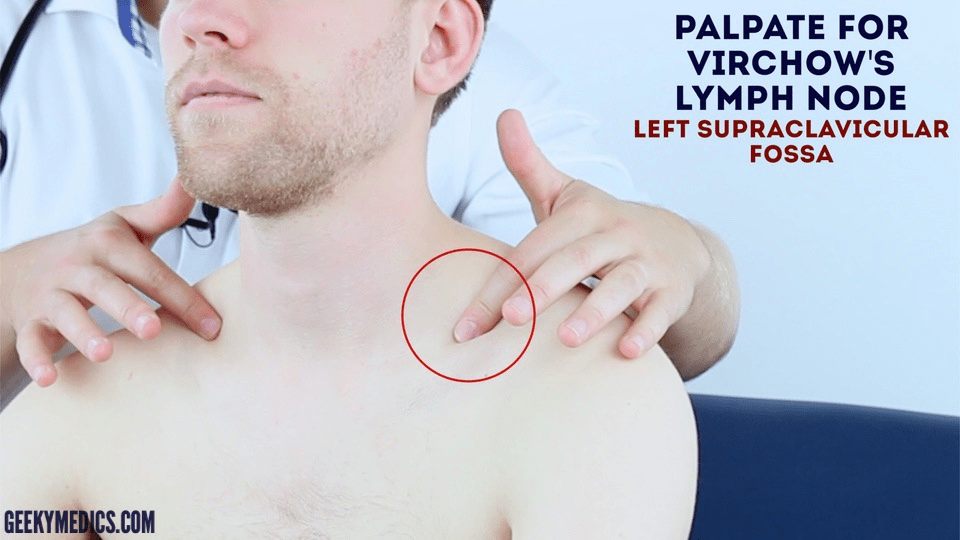 Any palpable lymph node in the supraclavicular fossa is abnormal. A Virchow node is specific for the left side because a large part of the body is drained by the lymphatic system going to the thoracic duct on the left. Classically, a Virchow node is considered a sign of gastric cancer or gastrointestinal cancer, but it can show up from any metastatic cancer in its drainage area. An enlarged lymph node in the right supraclavicular fossa is bad too; it just is less likely to be from a gastrointestinal cancer.