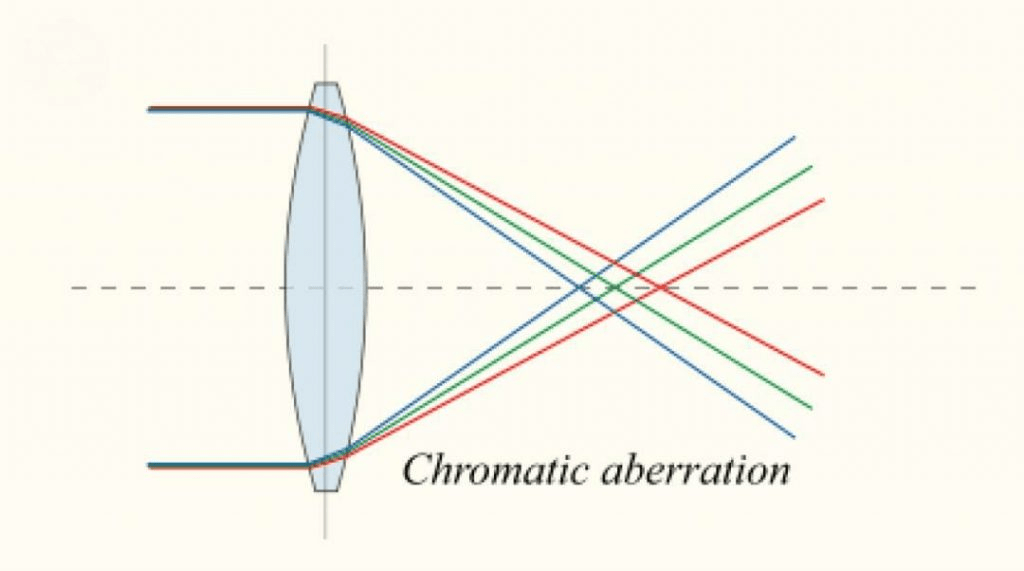 chromatic aberration – An optical phenomenon where a lens fails to focus all colors to the same convergence point. This causes a distortion where edges of objects may appear fringed with color, typically red, blue, or green, due to differences in light wavelength refraction.