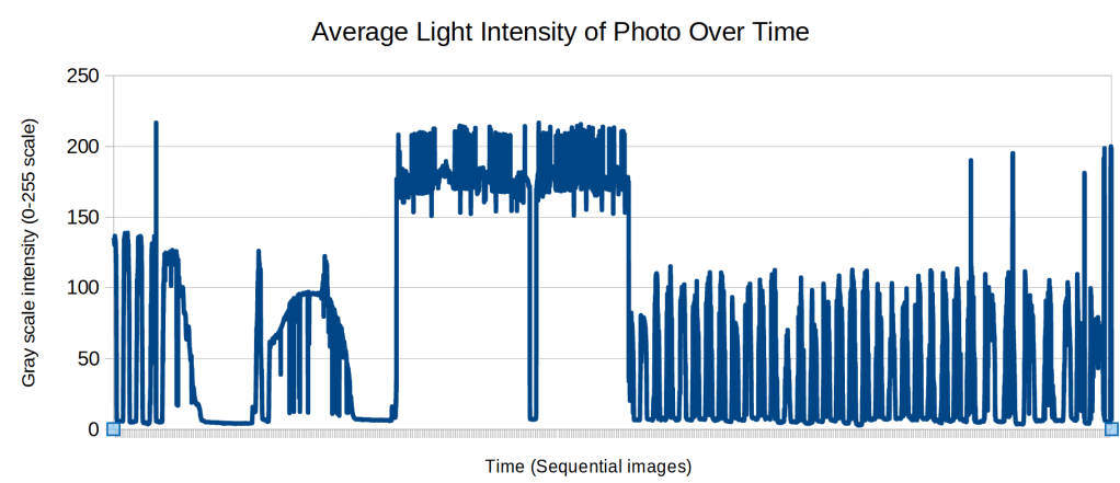 I wrote a Python program to calculate the average grayscale intensity of each photo. This shows the day and night cycle as well as the times when the LED was on continuously. It also shows when the frequency of images was increased.