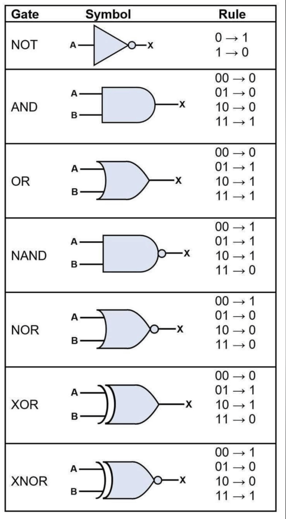 A diagram showing the symbols and truth tables used for various logic gates in circuit design.